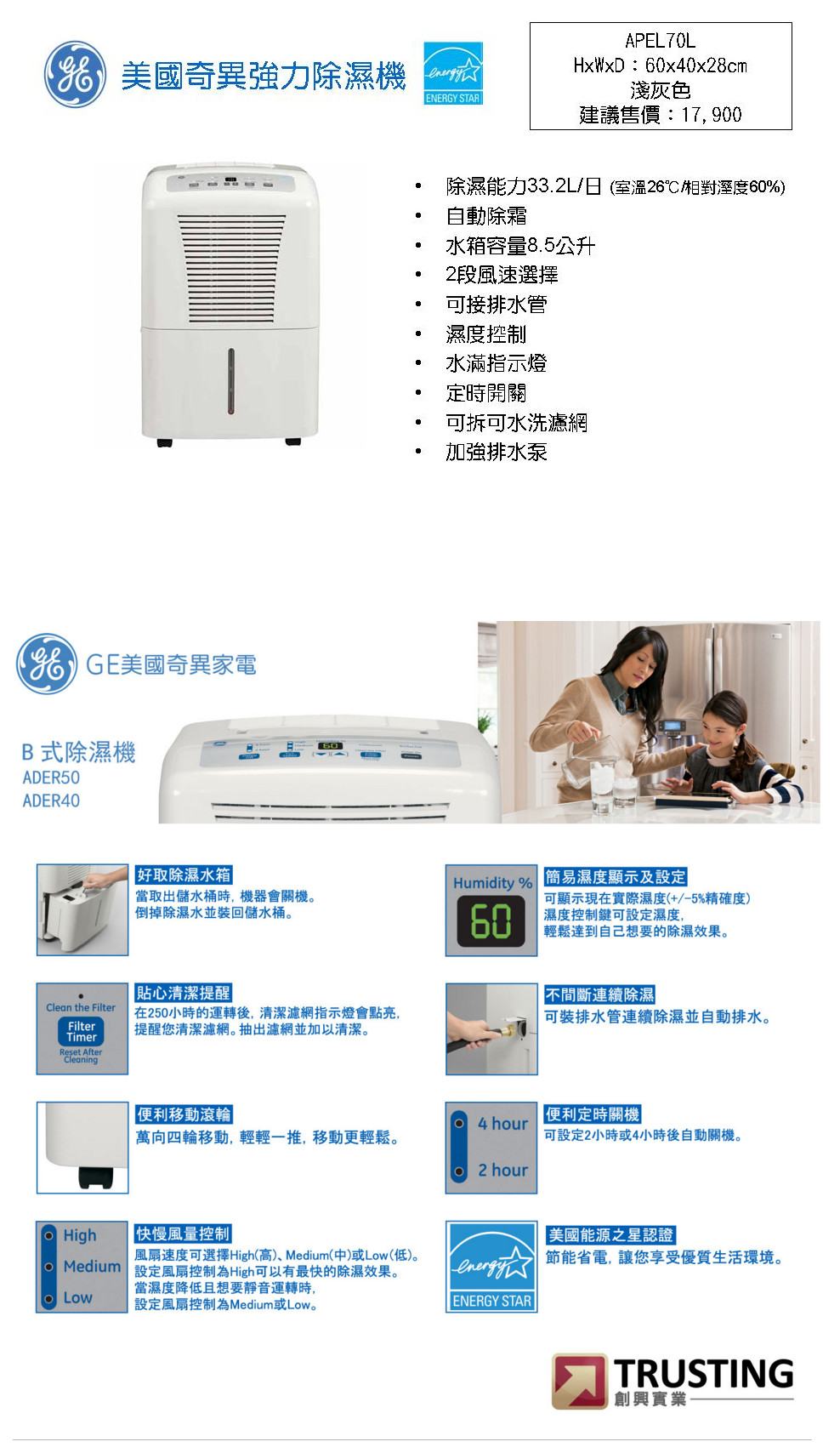 奇異 GE 微電腦33公升除濕機 ADER70L