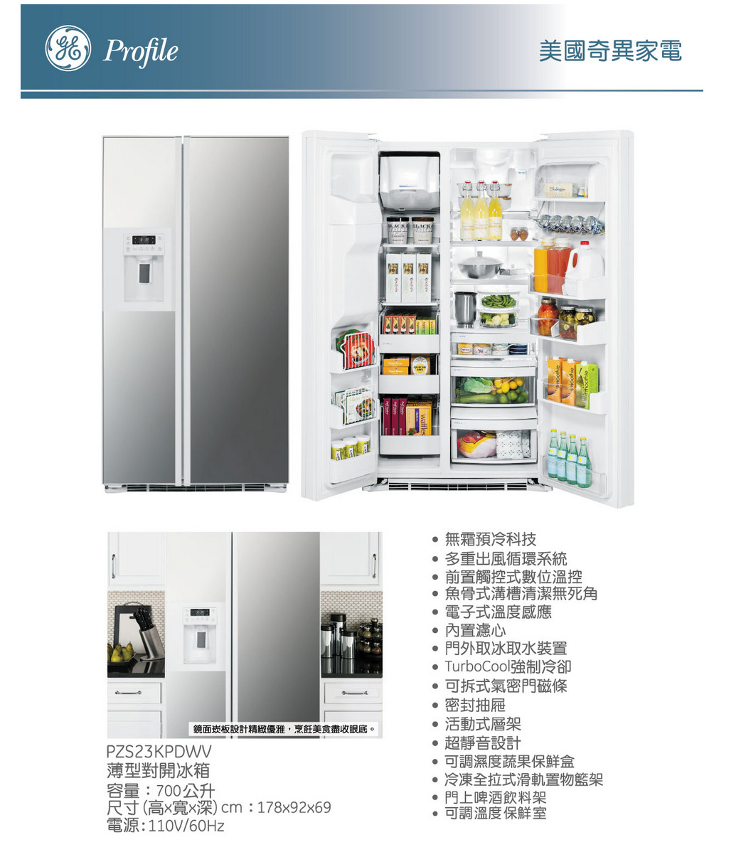 奇異 GE 702L 薄型對開門冰箱PZS23KPDWV