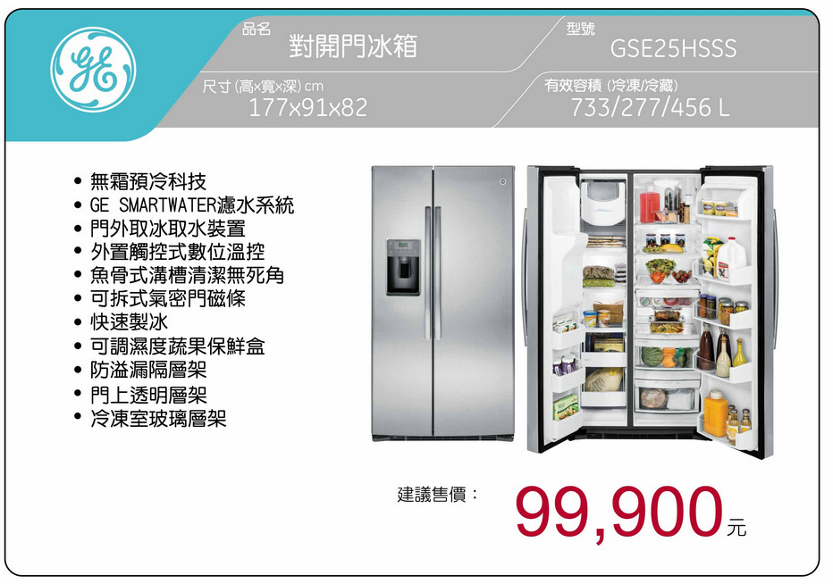 奇異 GE 733L 不鏽鋼對開門冰箱GSE25HSSS