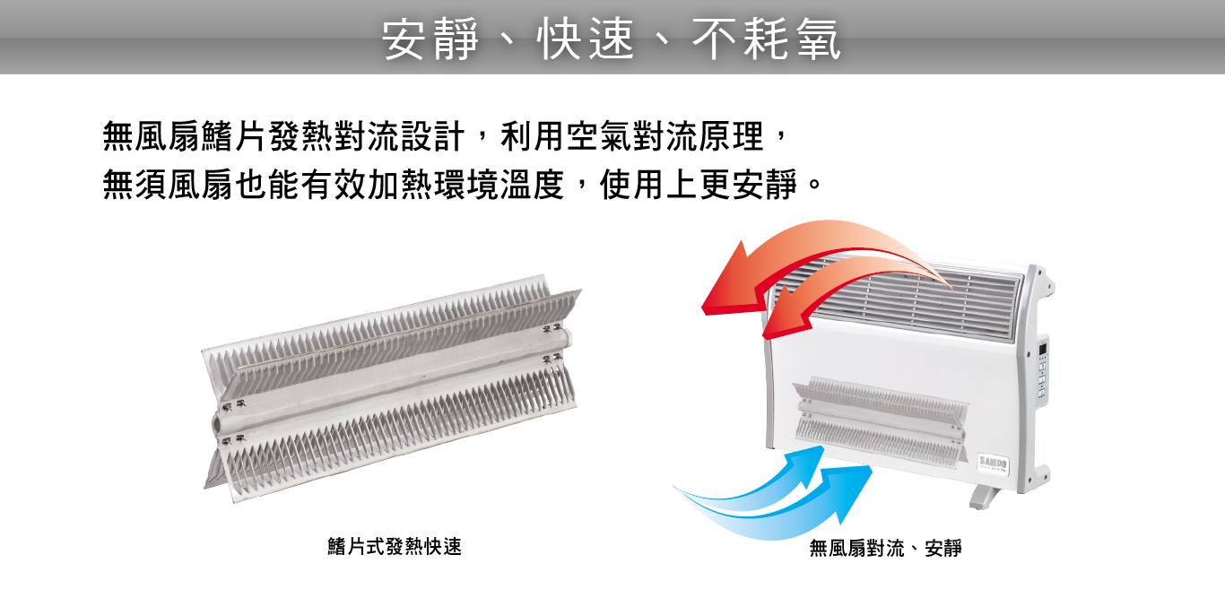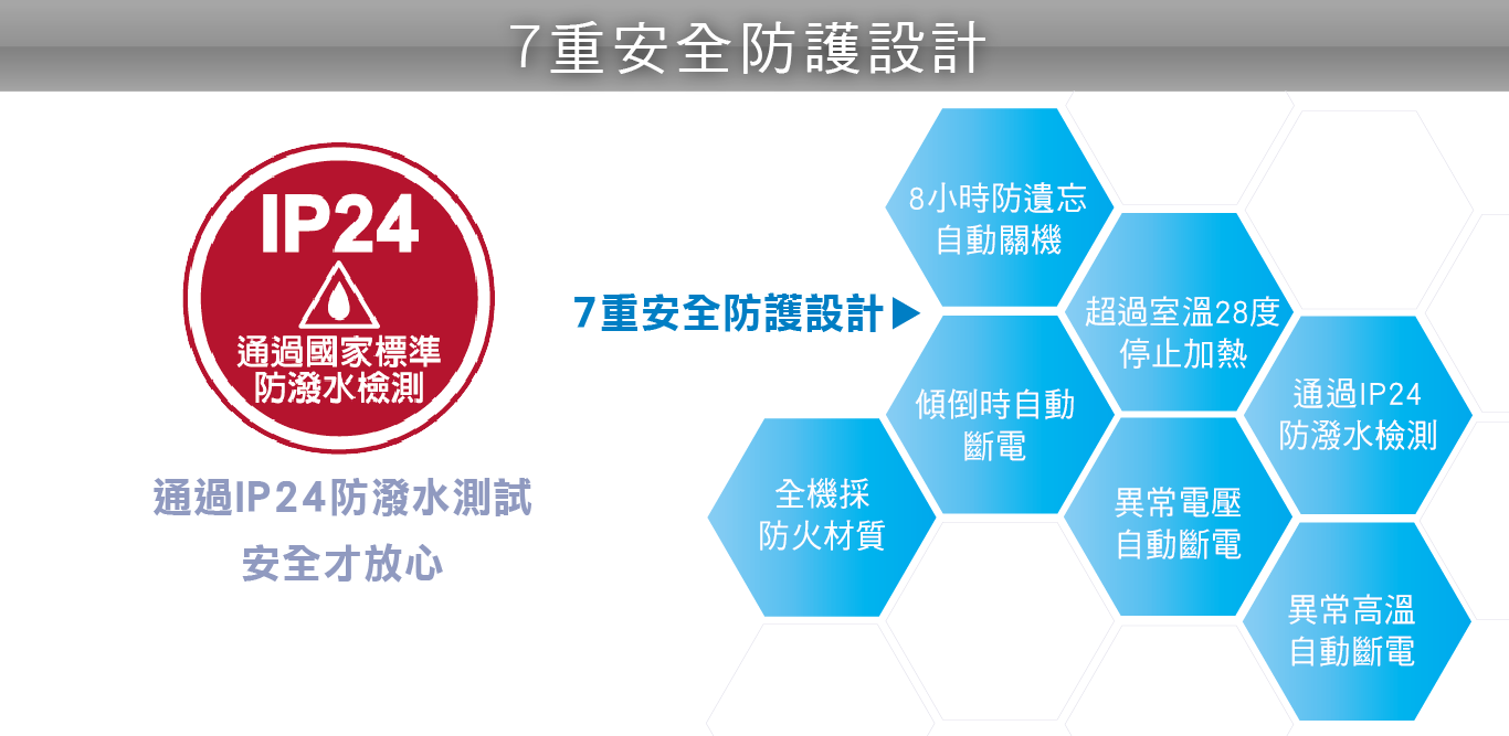 微電腦溫控,暖房舒適 面板LED溫度顯示、鰭片式發熱, 安靜、快速、不耗氧 通過IP24防潑水測試 七重安全防護設計