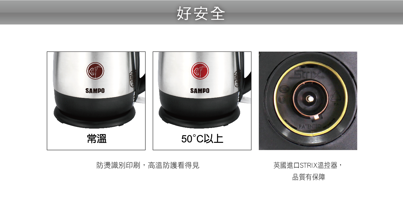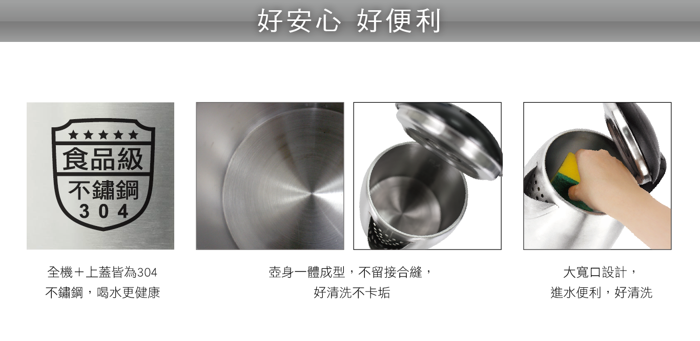 上蓋及機身採用可食用級不鏽鋼#304材質 英國進口STRIX溫控器,煮水更安心 內膽底部無縫設計,清洗無死角 防燙識別印刷,高溫變色提醒設計 360度分離式底座設計,無方向性,取用更便利 底部加熱設計,清洗更方便 單鍵自動開蓋,加水便捷不燙手 安全保護裝置 注水口加大設計,清洗更便利