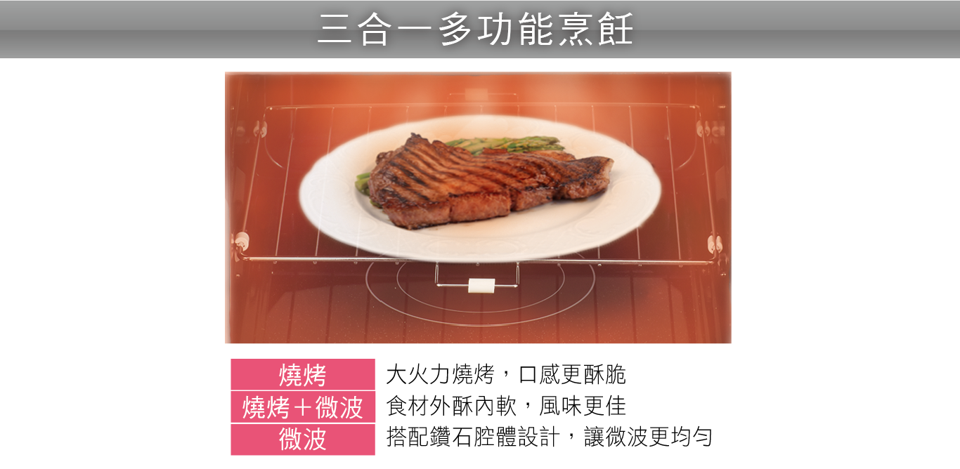 微波、燒烤、微波+燒烤三合一功能烹調 平面無死角,清潔更徹底 平台式微波,有效提升約30%空間, 均勻受熱,省時又省電 獨特128顆鑽石切面內腔體設計, 增加微波 反射加熱更均勻 12道自動烹調菜單