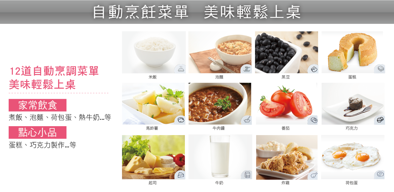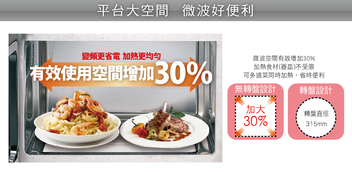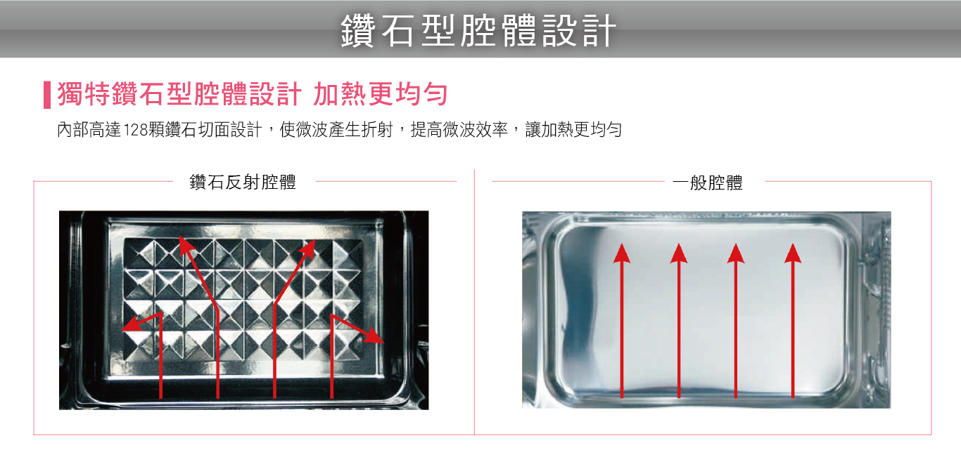 平面無死角,清潔更徹底 平台式微波,有效提升約30%空間, 均勻受熱,省時又省電 獨特128顆鑽石切面內腔體設計, 增加微波 反射加熱更均勻 12道自動烹調菜單