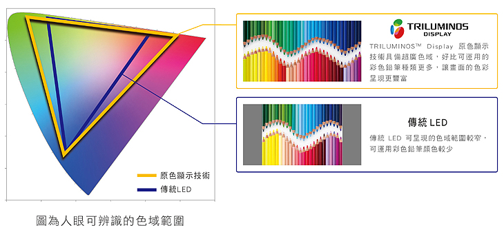 TRILUMINOS™ Display 原色顯示技術 Sony 獨家最新 TRILUMINOS Display 原色顯示技術,打破傳統液晶電視的色彩範圍限制,可顯示更寬廣的色域表現,呈現最豐富絢爛的真實原色。尤其一般液晶電視最難表現的紅色及翡翠綠,透過此技術,能生動地呈現更豐富、更細膩、更立體、更有層次的彩色世界,完美呈現嬌艷的紅、清透的湛藍、純粹晶瑩的翡翠綠,甚至膚色的光潤質感等,細膩的色彩層次將一一重現眼前。看見世界的真緻美麗,這將是您在電視螢幕前,前所未有的視覺體驗。 |