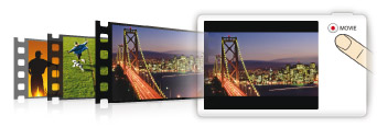 用 MOVIE 錄影鍵,隨時都可以開始錄影! 錄影的開始或停止,只要壓下 MOVIE 鍵即可。不用像以往進行麻煩的選單設定,也不需轉換模式,即可開始攝影。 |
