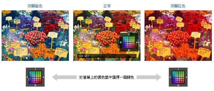透過白平衡,調整出最喜愛的色彩 ! 拍攝前於螢幕上的調色盤中選擇顏色,就可以輕易地設定白平衡,精準地控制色彩表現。更可以先透過 LCD 螢幕查看,確定想要拍攝的影像色彩。 |