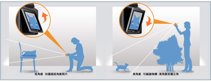 多角度 LCD 螢幕,讓拍攝更自由! LCD 螢幕可以多角度翻轉,讓您輕而易舉地拍出低角度或高出人們頭頂的高角度照片。 |