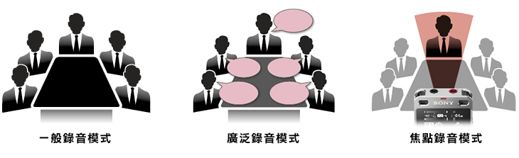 | 標準錄音模式讓一般的會議、小型討論都能擁有絕佳的收音品質。而廣泛及焦點錄音模式,能分別針對多人會議的廣泛範圍,清晰收錄左右方向的音訊來源,或是針對台上演講者、授課場合的焦點錄音,也能聚焦在前方的音源。同時能依照距離設定高、中、低聚焦或高、中、低廣泛效果,達到絕佳收音品質。 |