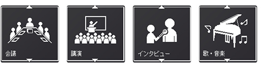 | 自動語音錄音、會議、講課、語音記事、面試、輕音樂、大音量音樂、我的場景 1、我的場景 2 ,共 9 種錄音場景選擇,依照最適當的條件設定錄音場景。 |