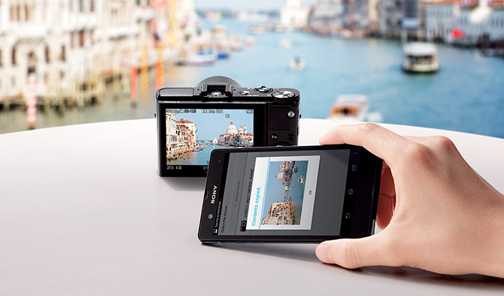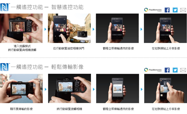 Sony 數位相機首度搭載便利的 NFC™ (Near Field Communication,近場通訊)* 技術,只要將您的 Android™ 智慧型手機或平板電腦與相機觸碰一下,立即就會在兩邊裝置建立起連線。除了下載免費的 PlayMemories Mobile 應用程式到裝置上,無需進行其他繁複設定。在建立連線後就能透過 Wi-Fi 無線網路從行動裝置遙控相機快門、立即取得拍攝的影像,並將傳至裝置的影像直接上傳到您愛用的社群網站。 * 需使用相容於 NFC 的 Android™ 裝置。裝置的保護殼可能不利於連線。 ![]() |