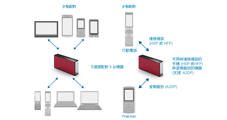 | 可連接配對 8 台機器;可同時連接通話的手機 (HSP 或 HFP) 與音樂撥放的機器 (支援 A2DP) 。 |