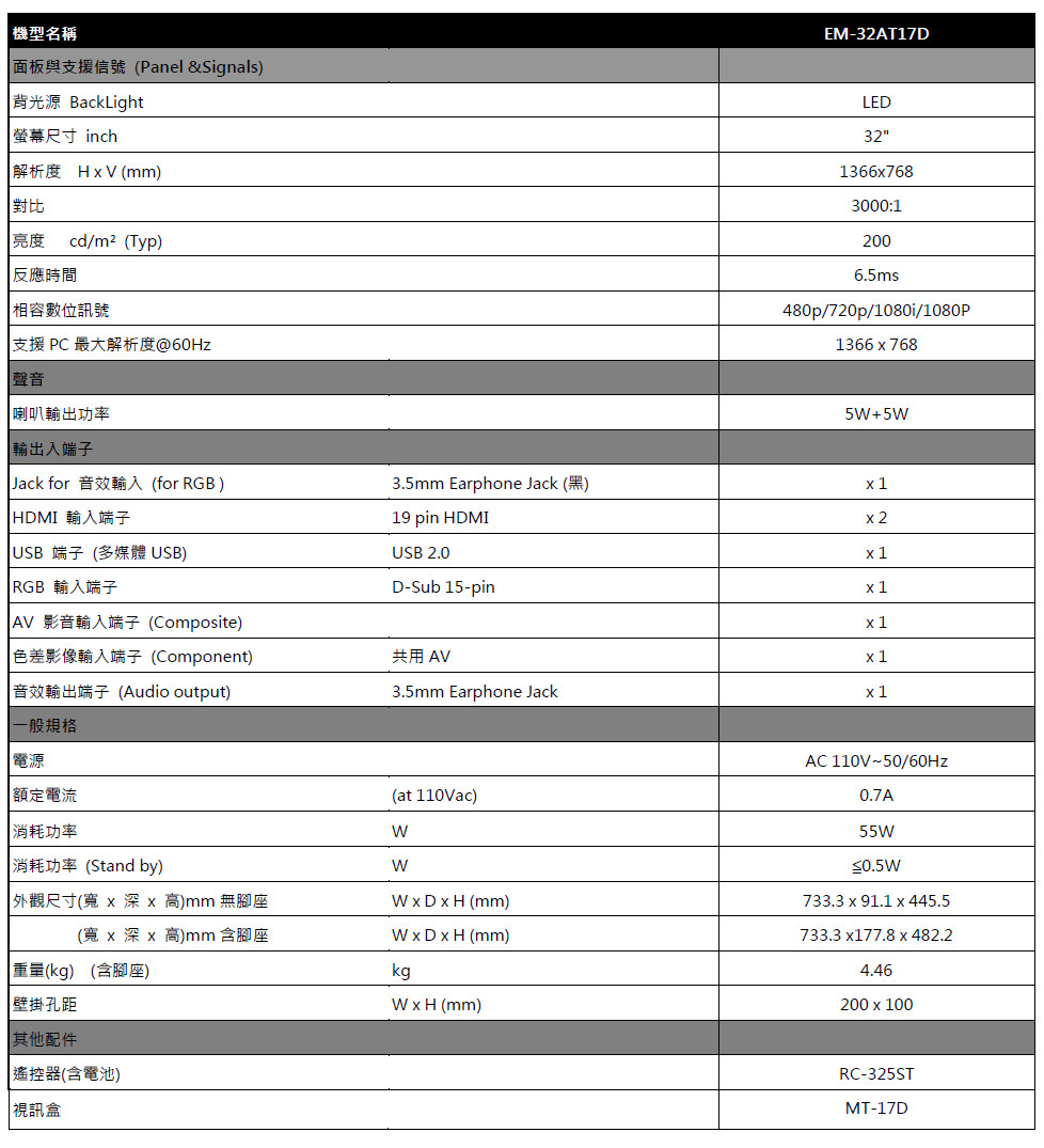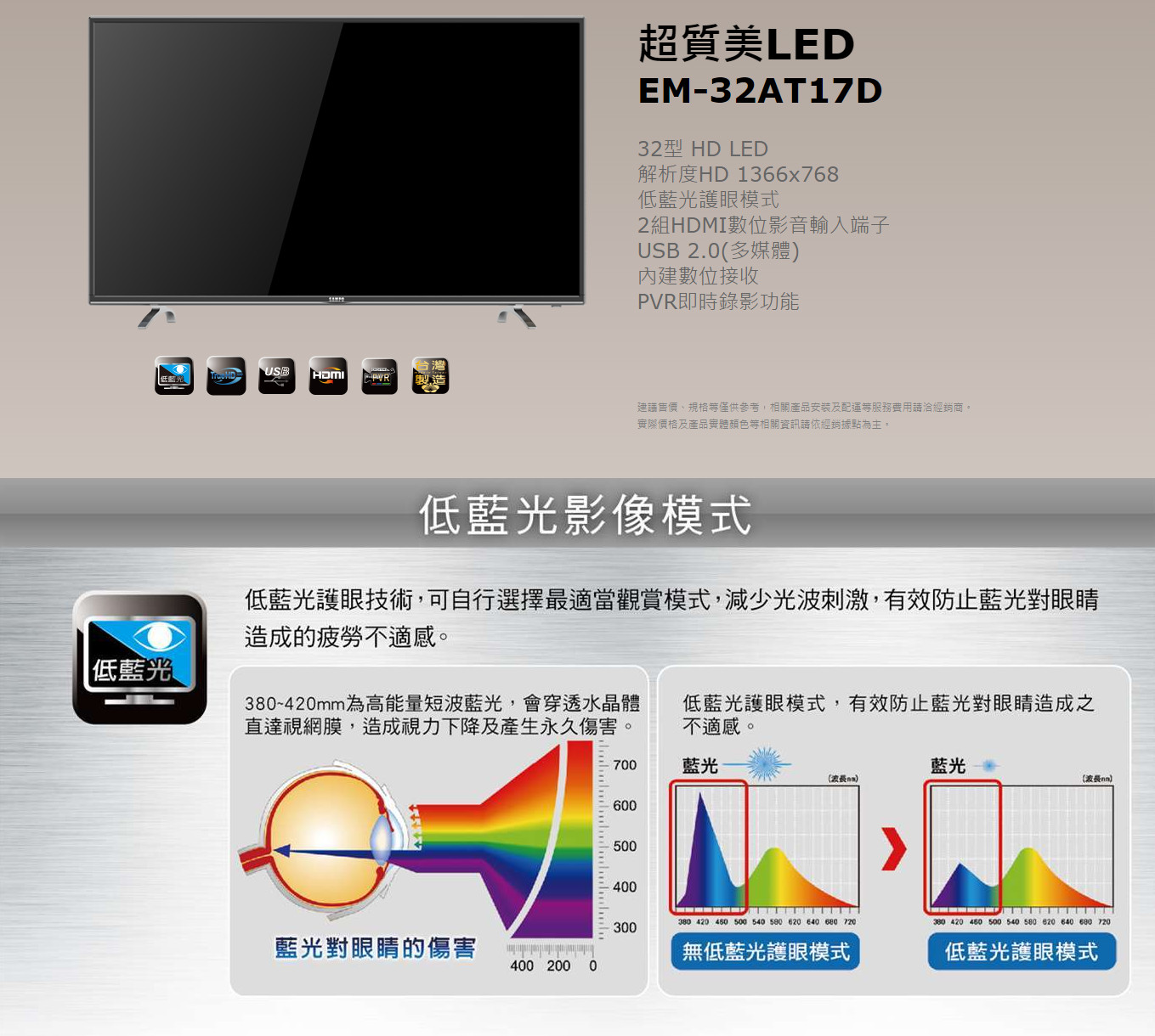 聲寶 SAMPO 32型 低藍光 LED液晶顯示器+視訊盒 EM-32AT17D