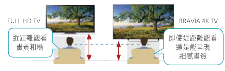 | 即使只有 Full HD 電視一半的觀看距離來觀賞 4K 電視,也無須擔心畫質顆粒感,能盡情享受大螢幕視角所帶來的絕佳臨場感。 |